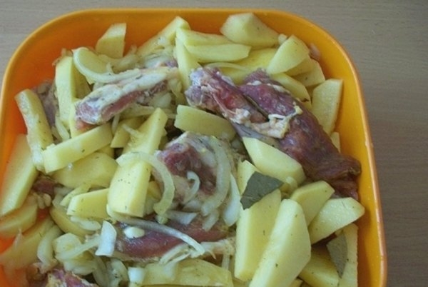 Шаг 1: Картофель очистить и промыть. Мясо и картофель нарезать, посолить и поперчить по вкусу. Перемешать.