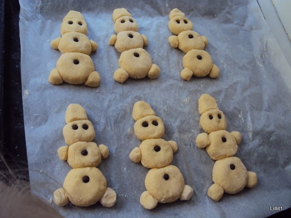 Заметки на полях: если у вас нет шоколадных капель, то его не следует заменять обычным шоколадом, т.к. при выпечке шоколад растечется, лучше глазки и носик нарисовать с помощью растопленного шоколада уже после выпечки печенья и дать застыть шоколаду, чтобы он не размазывался.