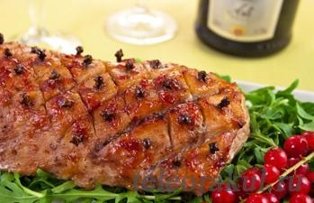 Сначала готовим соус: смешиваем лимонный сок, джем и мед. В мясе делаем надрезы и перекладываем в форму для запекания. Смазываем приготовленным соусом, солим, перчим и в ромбики вставляем гвоздику. Запекаем в духовом шкафу при температуре 180 градусов, один час. Свинина Праздничная готова. Приятного аппетита!