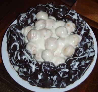 Сейчас будем строить гнездо. На плоское блюдо положите слоем шарики (дно), облейте расплавленным шоколадом. После чего проделайте из шариков бортик ( гнездо ), тоже облейте расплавленным шоколадом.