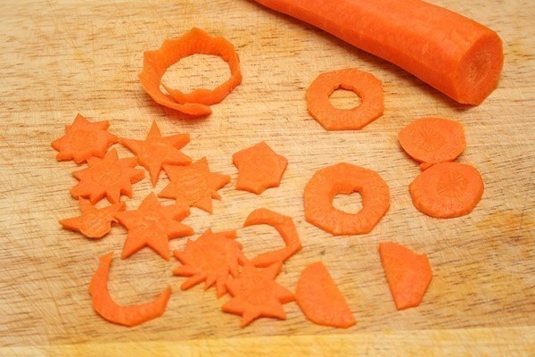 Пока доваривается бульон, отварить яйца в крутую, охладить их, затем почистить. Морковь почистить, для мягкости ее можно предварительно проварить в бульоне примерно 5−7 минут, но это на любителя. Нарезать забавными формами для дальнейшего украшения холодца.