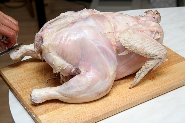 Снять кожу с курицы. У меня курица была очень большая 5 кг, поэтому я использовала только половину, если у Вас небольшая — используйте ее целиком.
