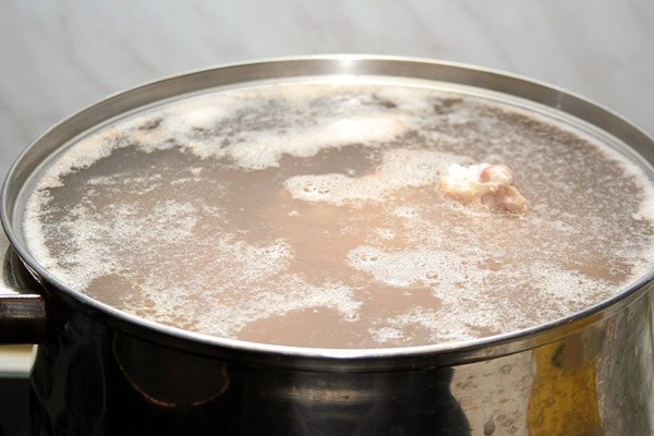 Когда вода закипит, снять пену и уменьшить огонь. Варить 4 часа на медленном огне, периодически снимая пену и жир. Воды должно остаться в 2 раза меньше и мясо полностью отойти от кости. Добавить очищенную морковь, луковицу, чеснок, варить еще 30 минут.