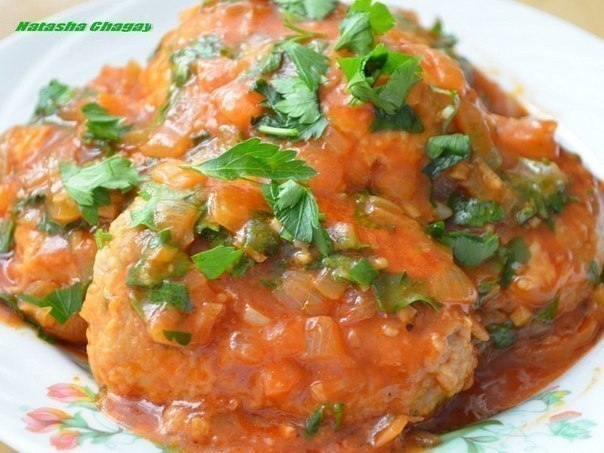Соус: 1 крупная порезанная луковица, томат паста 3 ч л, сахар, соль, перец, вода, мука 1 ч л, зелень. Обжарить лук, посыпать мукой, пожарить 1-2 мин, добавить томат пасту, перемешать, потомить 3 мин, влить воду, немного потушить. Залить котлеты, тушить до готовности. В конце посыпать зеленью.