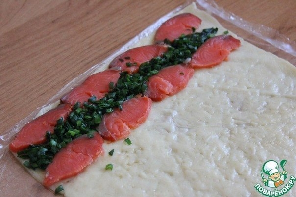 Зелень вымыть, обсушить и мелко нарезать. Рыбу очистить от костей и кожицы, нарезать на ломтики. Рыбу в идеале использовать - сёмгу, форель, но можно горбушу или кету. Выложить ломтики рыбы рядами на сырный пласт, чередуя с рядами зелени.