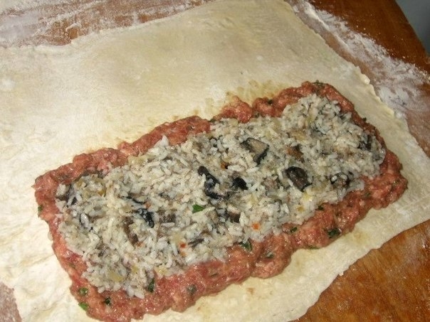 На край теста выкладываем прямоугольником мясной фарш толщиной до 1,5 см. Сверху на него выкладываем кашу с грибами, но меньшим прямоугольником. По 2,5 см по длинному краю оставляем. Так как печем два пирога, то и начинку делим пополам.