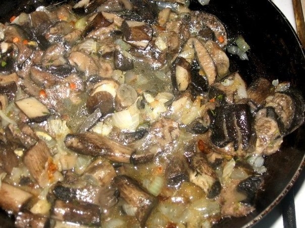 1 стакан грибов обжарим на масле с 0,5 стакана порезанного лука-репки. Можно брать шампиньоны. У меня стакан вареных подберезовиков. Посолим и приправим по вкусу.
