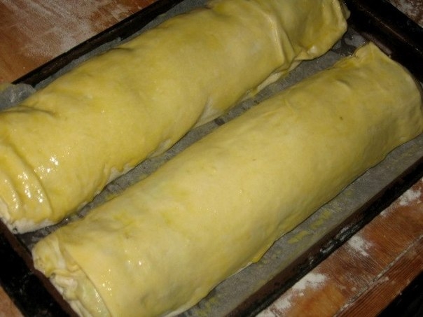 Выкладываем рулеты на противень швом вниз, смазываем желтком и ставим в духовку на 25-30 минут при 180-200 градусах. Пока сверху не зарумянится.