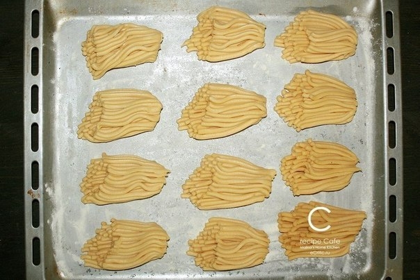 Тесту придаем форму "колбаски" и начинаем пропускать через мясорубку. Когда тесто начинает выходить, ждем, пока оно опустится сантиметров на 5-7 и тогда рукой его приподнимаем снизу и срезаем ножом. Таким образом получается правильная форма!-пушистый цветок и основание. Кладем его на противень. Чтобы след. "цветок" тоже получился красивым, надо счистить остатки теста с "решетки" мясорубки! Когда тесто в мясорубке заканчивается, добавляем ещё из холодильника и продолжаем! Старайтесь делать всё быстрее чтобы тесто не начало таять на столе и терять форму!