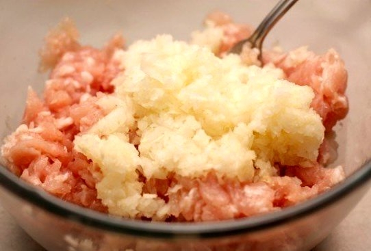 Луковицу очистить и хорошенько измельчить (лучше всего при помощи блендера или потереть на терке) и добавьте к фаршу вместе с яйцом.