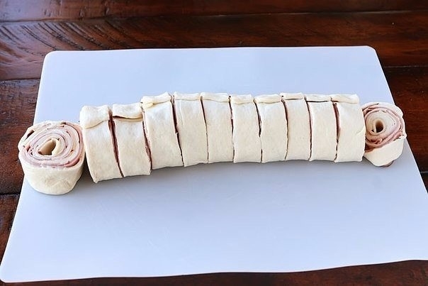 Сверните тесто в рулет так, чтобы начинка не выглядывала. Закрепите края и шов рулета.Нарежьте рулет на кусочки, каждый по 3-4 см в ширину.Выложите булочки на противень, застеленный пергаментом для выпечки. Смажьте булочки взбитым яйцом.Разогрейте духовку до 200 градусов. Выпекайте булочки в духовке 15 минут до характерного румяного цвета.