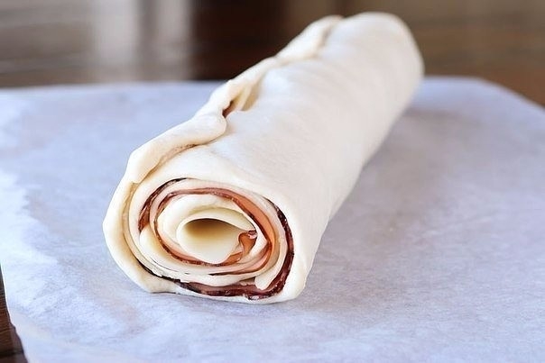 Доску присыпьте мукой. Выложите на нее тесто и раскатайте его в тонкий пласт толщиной 1-1,5 см.На тесто выложите нарезанную ветчину. У меня она довольно большая в диаметре. Важно нарезать ветчину тонко или воспользоваться слайсером (в супермаркете).Возьмите сыр. В продаже имеются упаковки, когда сыр нарезан на пластины. Вместо твердого сыра можно взять пластинки плавленого бутербродного сыра типа "Хохланд". Ветчину накройте пластинками сыра.