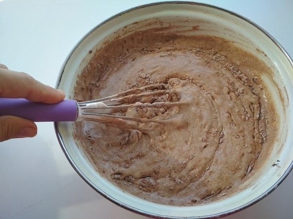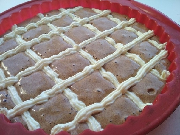 4. Темное тесто выложить в форму для выпечки. Творожной массой нарисовать на поверхности клеточки.