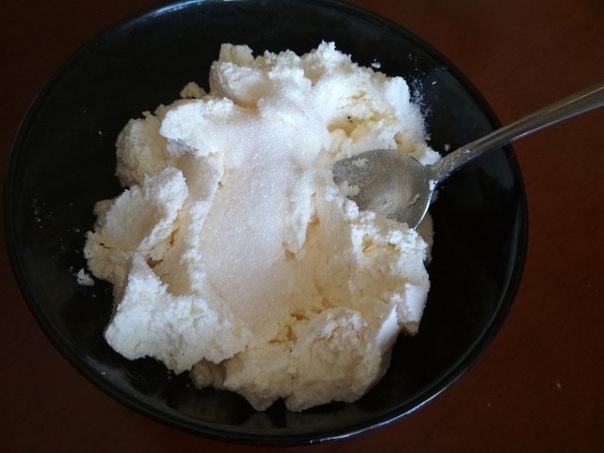 3. Развести творожную массу. Для этого протертый творог соединить с крахмалом и сахаром. Переложить массу в кондитерский мешок.
