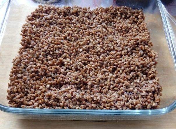 5. В форму для запекания ровным слоем выложить напитавшуюся водой гречку. Покрыть ее тонко нашинкованным луком и морковью. Сверху разместить куриные голени, накрыть фольгой или бумагой для выпечки и поставить в горячую духовку.