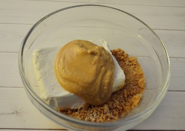 2. Добавить творог, ванилин и арахисовую пасту. Перемешать.