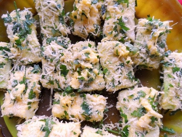 3. Брусочки кабачка сначала обвалять в муке, затем обмакнуть в яйцо, взбитое вилкой с солью в отдельной тарелочке, затем снова обвалять в приготовленной панировке и выложить на силиконовую форму.