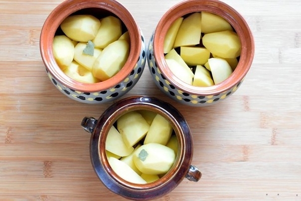 3. Картофель очистите и крупно нарежьте. Выложите в горшочки, добавьте лавровый лист — совсем немного.