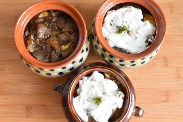 5. Посолите по вкусу и залейте горшочки горячим бульоном – мясным или грибным, можно и кипятком, но с бульоном вкус богаче. Сверху в горшочки положите по ложке сметаны и добавьте немного укропа – лучше свежие семена.
