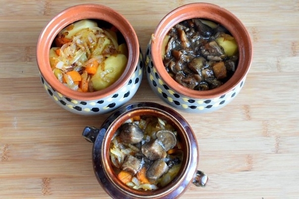 6. При желании и наличии раскатайте из сдобного или слоеного теста кружочки и накройте ими горшочки. Или плотно накройте крышками и сверху фольгой – важно, чтобы блюдо томилось без доступа воздуха. Поставьте горшочки в разогретую до 150°С духовку минут на 40. Дайте настояться в выключенной духовке еще минут 15.