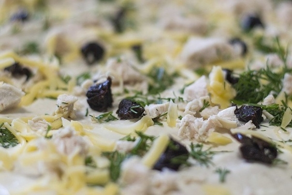 1. Подготовить продукты, отварить филе. Мясо, чернослив и укроп порезать, сыр натереть на крупной тёрке.