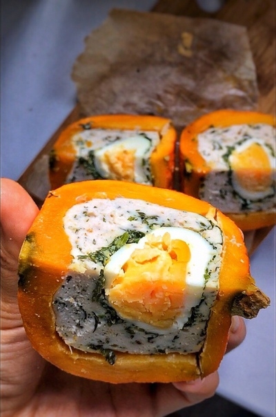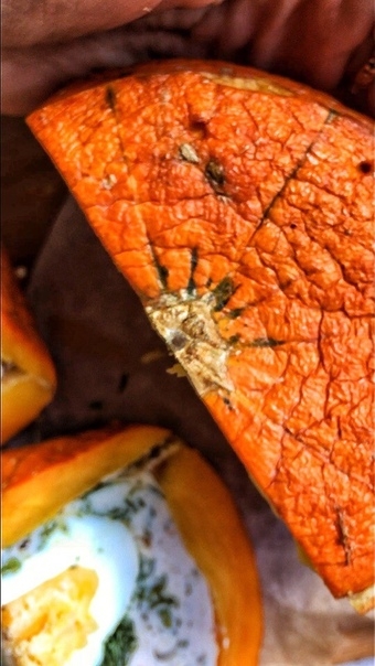 4. Собрать тыкву как на фото (по желанию можете и специи добавить) и в духовку на 30 минут.