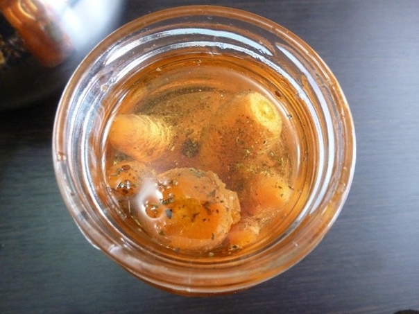 5. Сложить морковь в чистую банку, добавить базилик и залить остывшим маринадом. Закрыть крышкой и отправить на хранение в холодное место. Попробовать такую морковь можно через месяц, тогда она будет готова к употреблению.