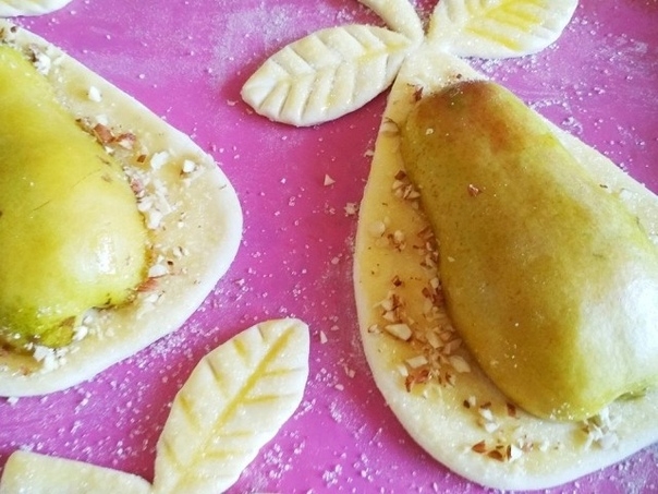 2. Тесто разделить на равные части, рассчитывая на 4 груши. Затем слегка вдавить грушу (чтобы виден был ее контур) и, отступив 1 см от ее краев, вырезать заготовку с листочками.