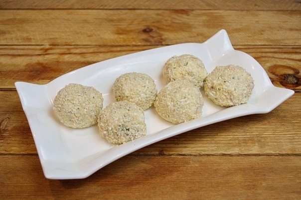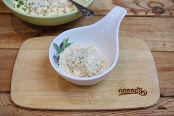 5. Мокрыми руками скатайте из массы шарик. Обваляйте его в кунжуте. Так сформируйте все шарики.