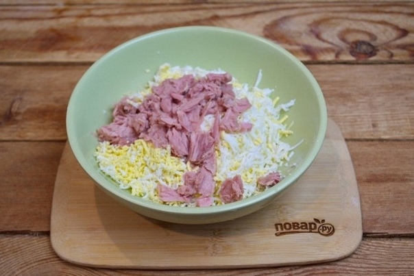 3. Добавьте консервированный тунец. У меня тунец в собственном соку. Жидкость я отжала, чтоб полученная масса не плыла и держала форму. Можно взять тунца в масле, но само масло лучше слить и добавить непосредственно мякоть тунца.