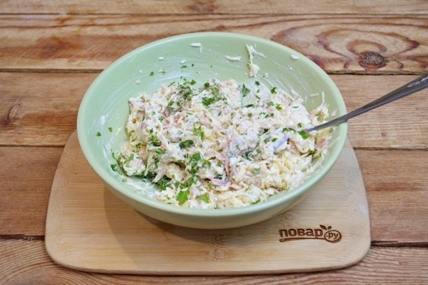 4. Добавьте измельченный укроп (или петрушку). Заправьте массу майонезом и перемешайте. Соль и специи я не добавляла. Тунец дает вкус, а соль есть в майонезе. Но вы можете добавить, если хотите.