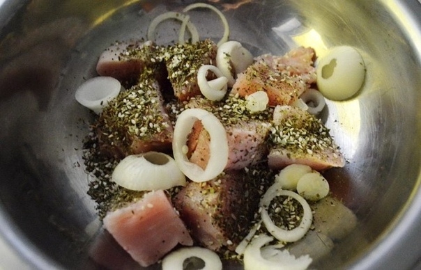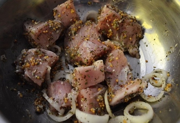 1. Грудку нарезать крупными кусочками, посолить. Добавить прованские травы, кунжут и кольца лука.