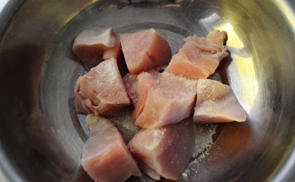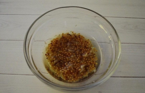 3. Смешать масло, рисовый уксус, горчицу и пропущенный через пресс чеснок. Полить мясо маринадом и оставить на 1 час.