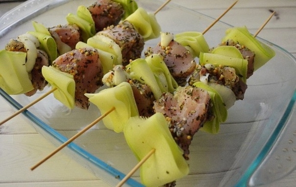 5. Слайс сложить гармошкой, надеть на шпажку. Затем мясо и кольцо лука. Чередуя, заполнить шпажки. Положить на огнеупорную форму, чтобы не касались дна. Отправить в разогретую до 180 °С духовку на 40-50 минут.