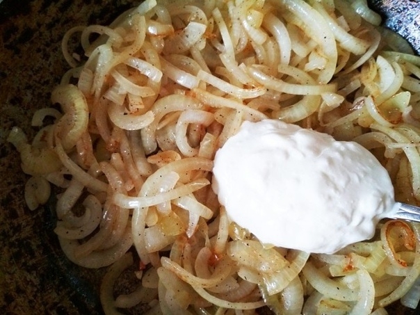 3. В это время обжарить весь лук, нарезанный полукольцами. Подсолить, поперчить. В конце добавить сметану.
