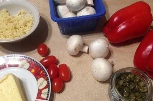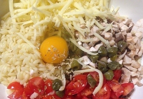 7. Добавляем небольшое сырое яйцо, сушеный орегано и каперсы. Перемешиваем — и начинка для перцев готова.
