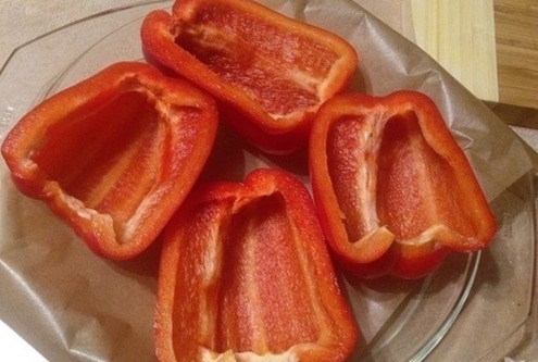 3. Включаем духовку, пусть разогревается до 200 градусов. Перцы разрежем пополам, удалим сердцевину с семечками.