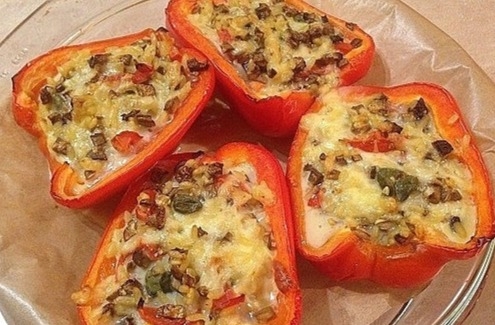 8. Распределяем начинку по половинкам перцев, ставим все в разогретую духовку.