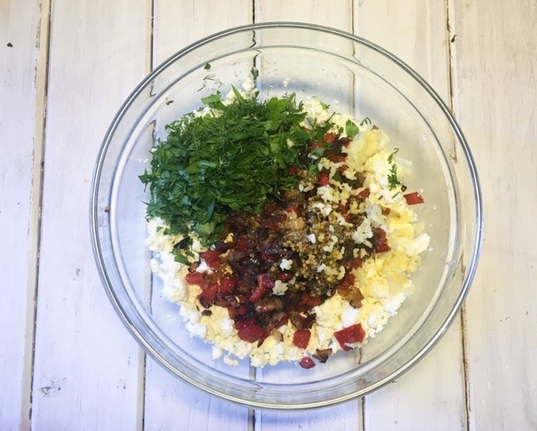 2. Смешать творог с обжаренными луком и перцем, специями, чесноком и зеленью.