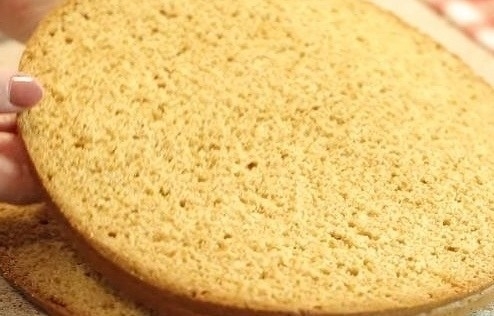 Медовый корж для торта немного остудить, и пока теплый - разрезать на 3 части.