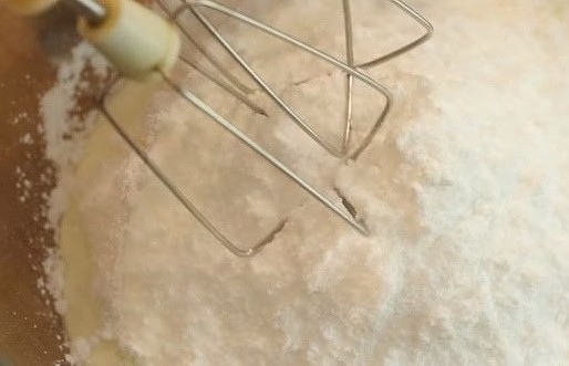 Пока печется медовик, готовим сметанный крем: взбиваем сметану и сахарную пудру.