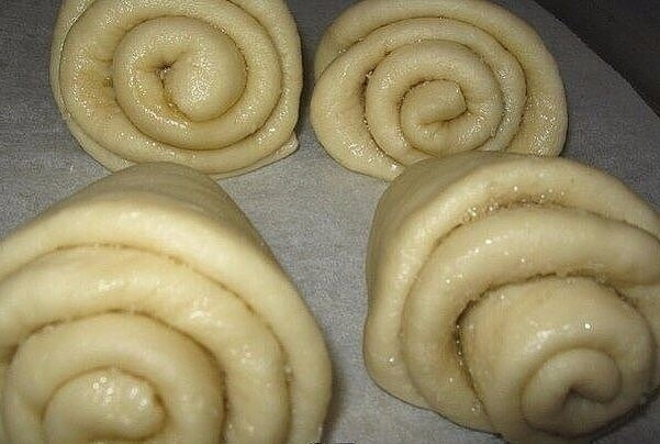 Готовое тесто разделить на шарики, величиной, как маленькое яйцо и раскатать их в тонкие лепешки. Каждую из них смазать растительным маслом, посыпать сахаром и сделать надсечку острым ножом от средины до края. С одной стороны лепешки поднять край и скатать по кругу в рулет-конус. Выложить плюшки на противень с бумагой для выпечки, дать расстояться минут 15-20 (можно смазать желтком) и поместить в духовку, разогретую до 190 градусов. Выпекать около 30 минут до готовности. При выпечке плюшки подымутся и разойдутся – получатся красивые завитушки. При подаче посыпать сахарной пудрой
