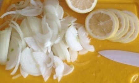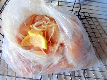 В тарелку выкладываем филе, лук, лимон, солим, перчим, добавляем паприку, наливаем масло. Перемешиваем всё руками, стараясь выдавить из лимона и лука сок. Перекладываем все в пакет и убираем в холодильник на сутки.