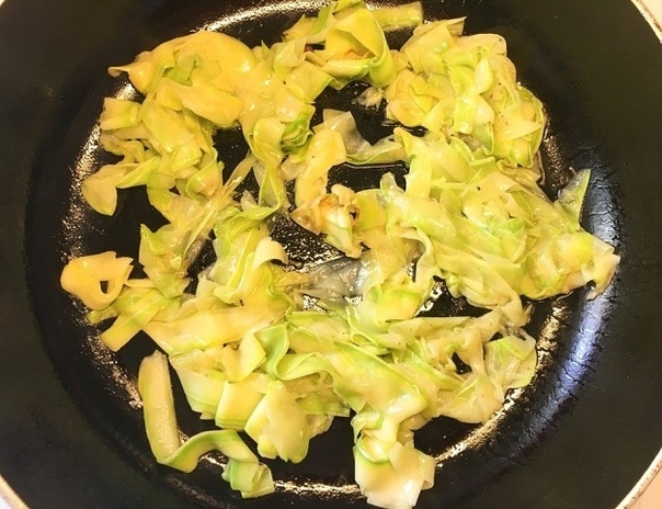 2. Кабачки нарезать тонкими ломтиками (до семян) и разрезать по вертикали, придавая форму лапши. Обжарить кабачки на хорошо разогретой сковороде частями по 1 минуте, посолить, поперчить.