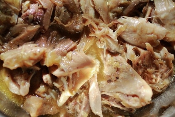 4. Снимите остывшее мясо с костей большими кусками. Отправьте в бульон и оставьте остывать в холодильнике 30–40 минут.