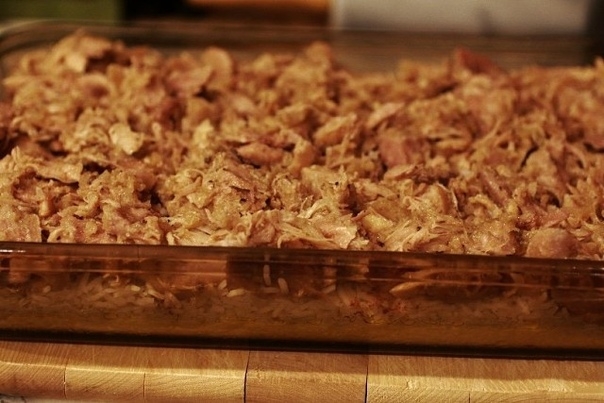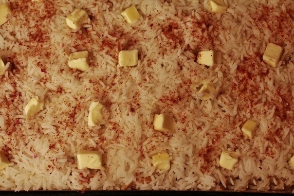 11. Для четвертого слоя разложите оставшийся отварной рис и сверху посыпьте специями, распределите кусочки сливочного масла (3 ст. л.) на одинаковом расстоянии друг от друга. Накройте форму фольгой для запекания, сделайте несколько надрезов и поставьте запекаться на 1 час 15 минут.