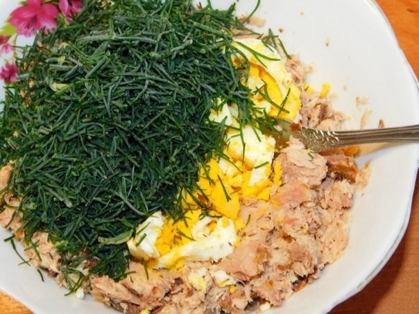 1. Откройте банку с тунцом, слейте жидкость и разомните мякоть вилкой.
