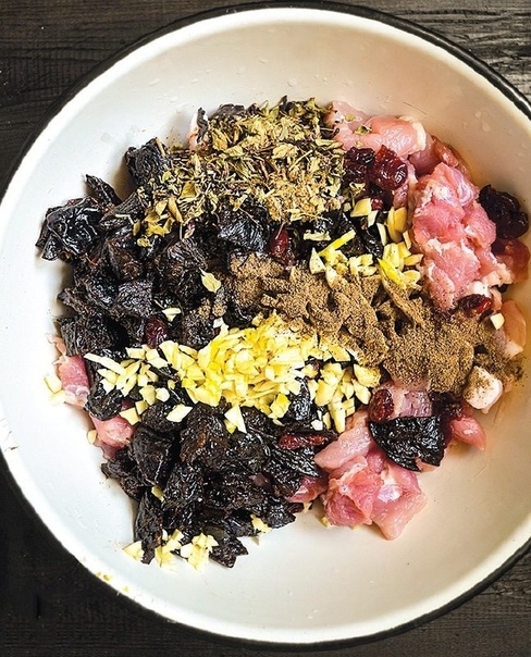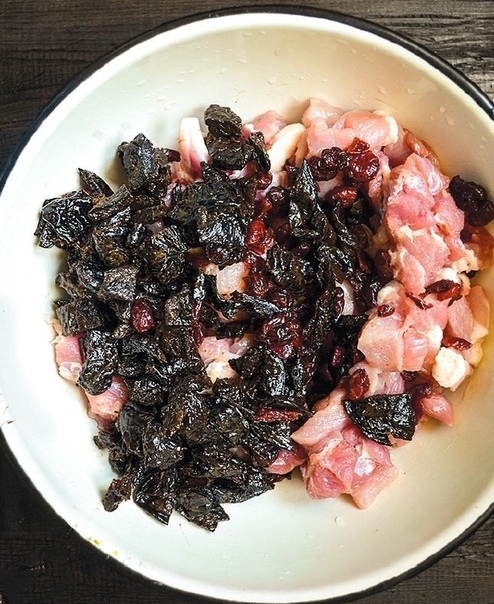 1. Свинину вымойте и зачистите от пленок. Нарежьте мелкими кубиками и положите в глубокую миску. Нарежьте чернослив без косточки и добавьте его к свинине вместе с клюквой.