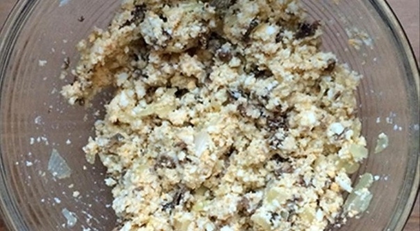1. Готовим начинку. Обжарим лук на растительном масле до золотистого цвета. Измельчим в блендере вареные яйца, смешаем с луком, грибами, чесноком и сухарями. Немного посолим.