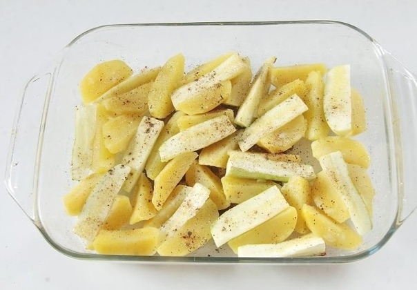 3. Кабачок разрежьте пополам и каждую половину еще на 4–6 частей. Распределите кабачки между картофелем, сбрызните овощи маслом, посыпьте солью и специями.